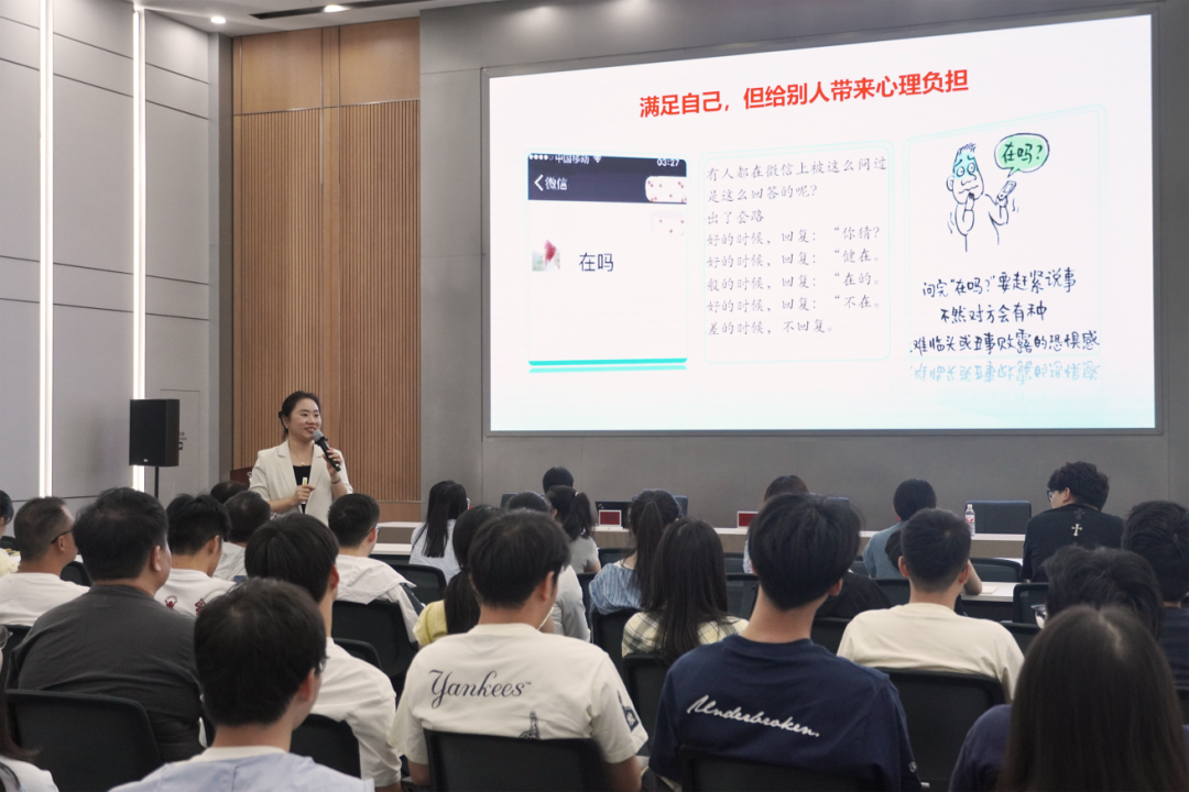 陈瑛老师的讲座围绕自我激励、协同沟通、对外沟通、对上沟通四大维度展开。首先,陈瑛老师分别以工作场景和生活场景中的沟通对话与大家进行互动,带领大家对“高情商”进行思考与剖析,由此展开当天的主题。随后,结合丰富的实战案例与互动环节,陈瑛老师层层递进,深入浅出地讲解了如何在日常工作中实现高效沟通,激发自我驱动力,提升团队协同效能。在长达2.5小时的课程中,陈瑛老师还结合商务礼仪的要点,根据不同场景对沟通实操进行了解析。并强调,良好的沟通不仅是技巧,更是一种心态与习惯的培养,也是实现个人与团队实现共同成长的重要途径。