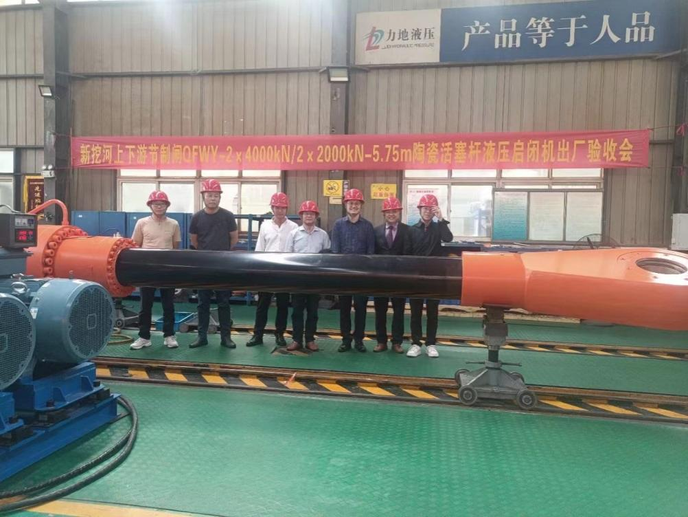 验收会上,验收小组认真听取了武汉力地液压设备有限公司关于超大型液压启闭机生产制造过程的汇报,并审阅了相关质检资料。随后,现场随机抽取液一套压泵站、一支主油缸和两支插销油缸,对其进行液压启闭机的机械、液压联调试验。经过认真讨论,验收小组一致认为新挖河上下游节制闸液压启闭机满足验收条件,同意通过出厂验收。
