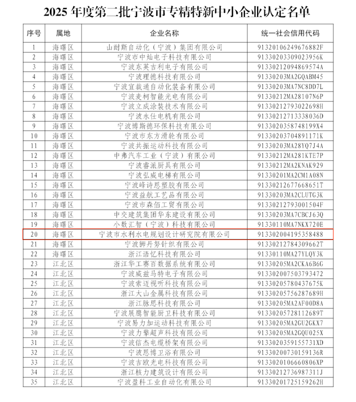 近日,宁波市经济和信息化局正式公布《2025年度复核通过及新认定第二批宁波市专精特新中小企业名单的通知》(甬经信中小〔2026〕30号),我院凭借多年深耕专业技术、...