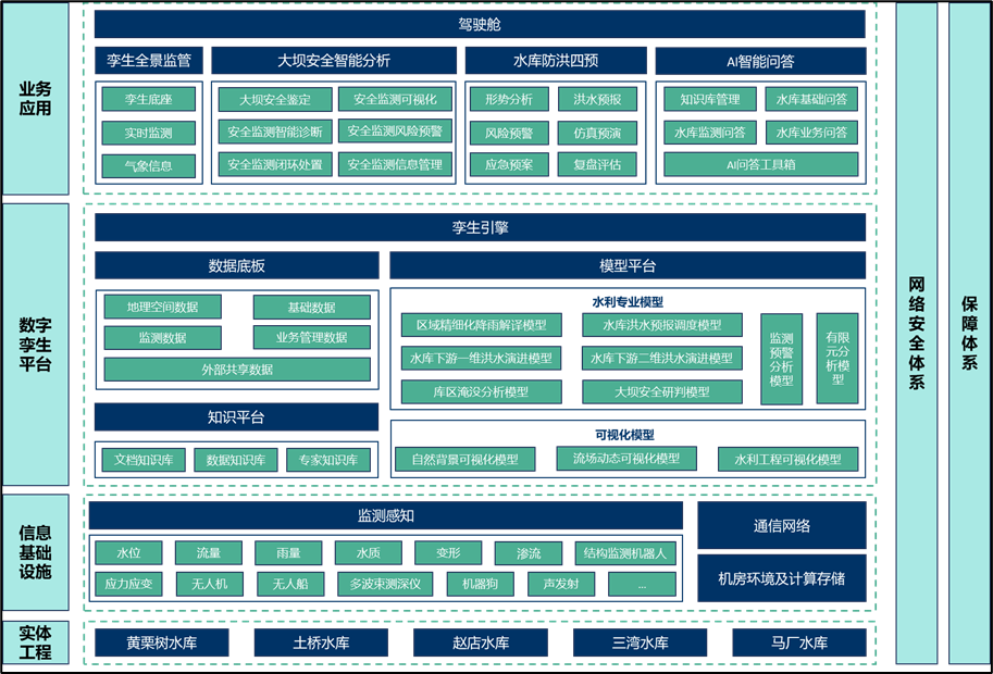 《方案》以黄栗树等五座水库为核心对象,进行了前瞻性的信息化总体设计。旨在通过引入先进信息技术,构建覆盖水库运行管理全生命周期的智能化体系。该体系以实现对水雨情、工情、供用水、水质及安全状况等关键要素的精准感知、动态监测、智能分析与高效决策为核心目标,全面提升水库在科学调度、风险防控、管理效能与服务保障方面的综合能力。主要建设内容涵盖智慧业务应用、数字孪生平台、信息基础设施及网络安全体系,共同构成层次清晰、协同联动、安全可靠的现代化水利信息化总体框架,为区域水安全与可持续发展奠定坚实的数字基石。
