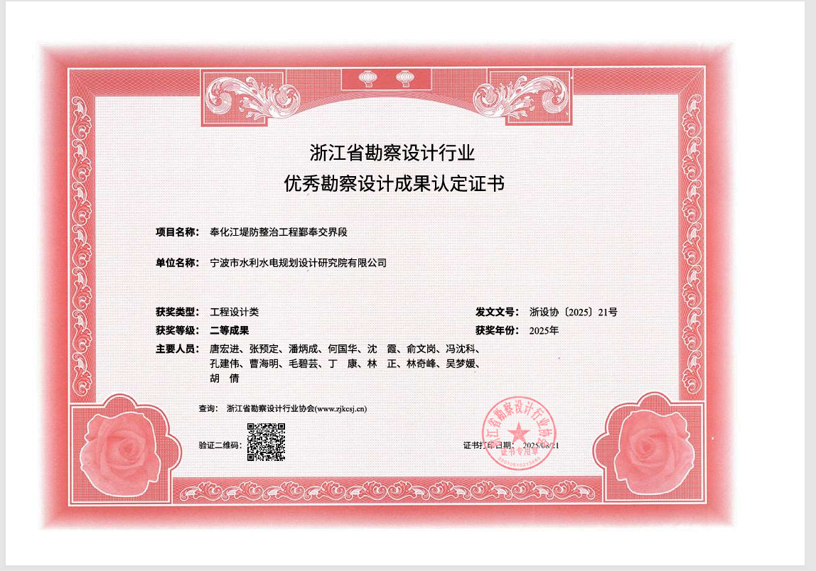 ●“奉化江堤防整治工程鄞奉交界段”获浙江省勘察设计行业优秀勘察设计”二等奖